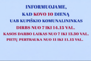Atkreipiame dėmesį į tai, kad statybinės ir griovimo atliekos (butų remonto ir sodybų tvarkymo atliekos) iš gyventojų nemokamai priimamos didelių gabaritų atliekų surinkimo aikštelėje, esančioje Technikos g. 6L, Kupiškyje, todėl apvažiavimo būdu šitos atliekos nesurenkamos. Informaciją apie šių aikštelių darbo laiką, priimamas atliekas ir kt. galima rasti UAB Panevėžio regiono atliekų tvarkymo centro interneto svetainėje http://www.pratc.lt.